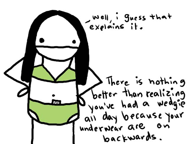 1. Ha ha! My kids do the same thing – sit on the floor to put on their underwear! Wait until you’re further into your 40’s – then you will have the required balance to put on your underwear while standing up! :p