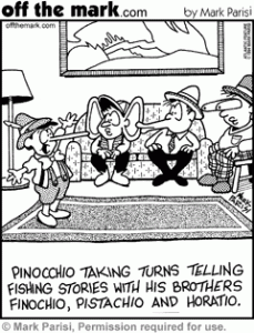“He’s good at exaggerating.” I said. “I’m actually writing about exaggerating. I’m wondering if his exaggerating will lead to telling lies.”