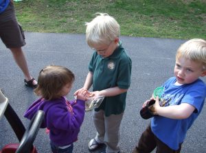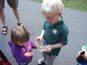 The loyal assistant to the entomologist shares his grub collection with the eager observer.