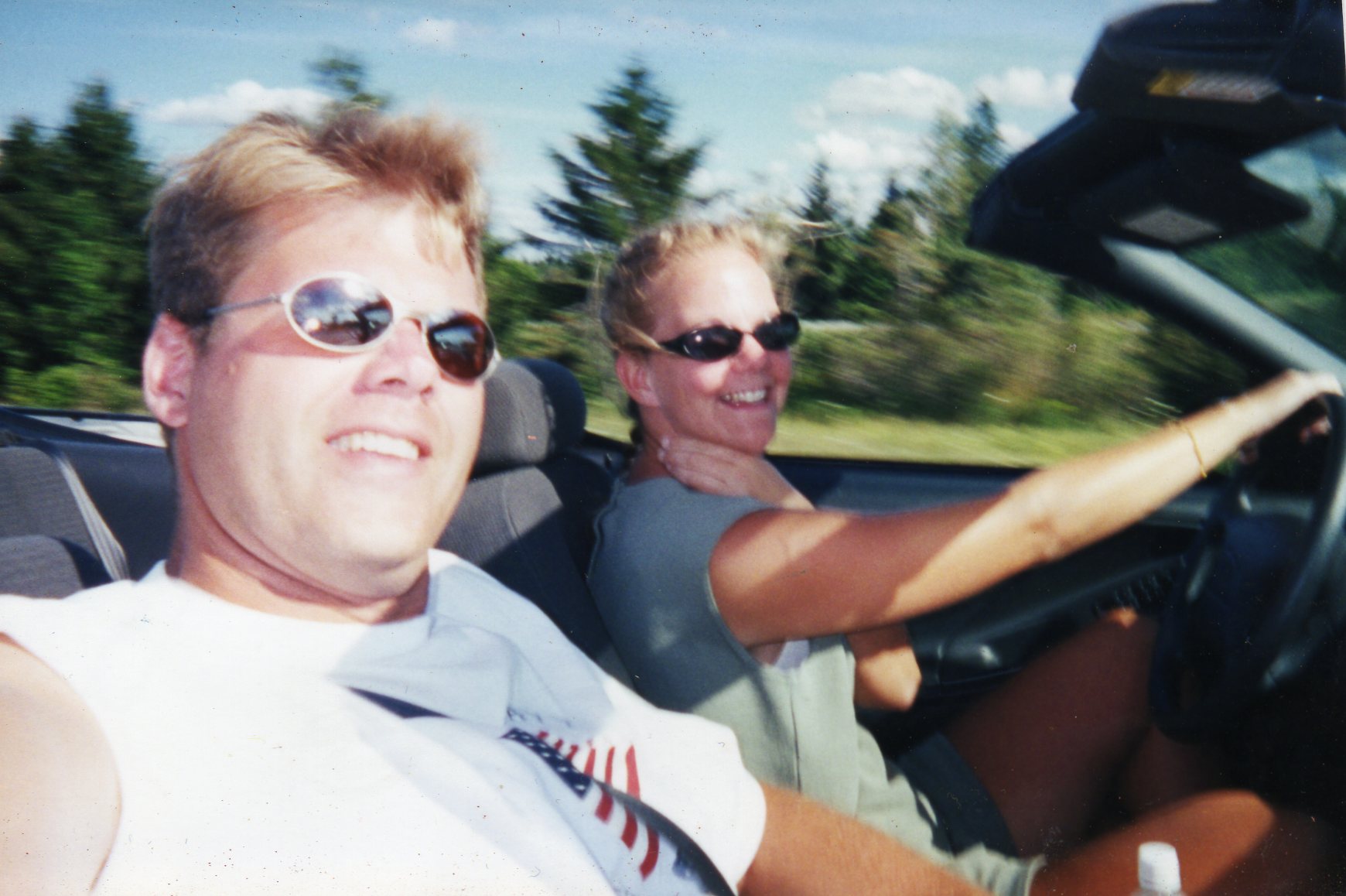 August 2000, pre-engagement, kids, marriage and 30s 40s. Me and Rob driving somewhere in Maine, on our way back from Amherst Shore, Nova Scotia; heading to Boston for a flight back home to Atlanta. The sun is shining, the skies are clear, the top is down, and the radio is loud. Life is good!