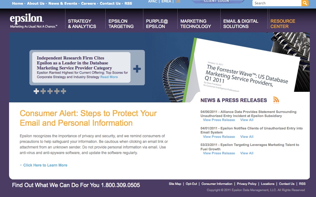 As a bonus, Epsilon’s press release (dated April 1st) states, “On March 30th, an incident was detected where a subset* of Epsilon clients’ customer data were exposed by an unauthorized entry into Epsilon’s email system.” Note the asterisk. What does the asterisk mean? Again, according to the press release, “* Updated April 4, 2011: The affected clients are approximately 2 percent of total clients and are a subset of clients for which Epsilon provides email services.”