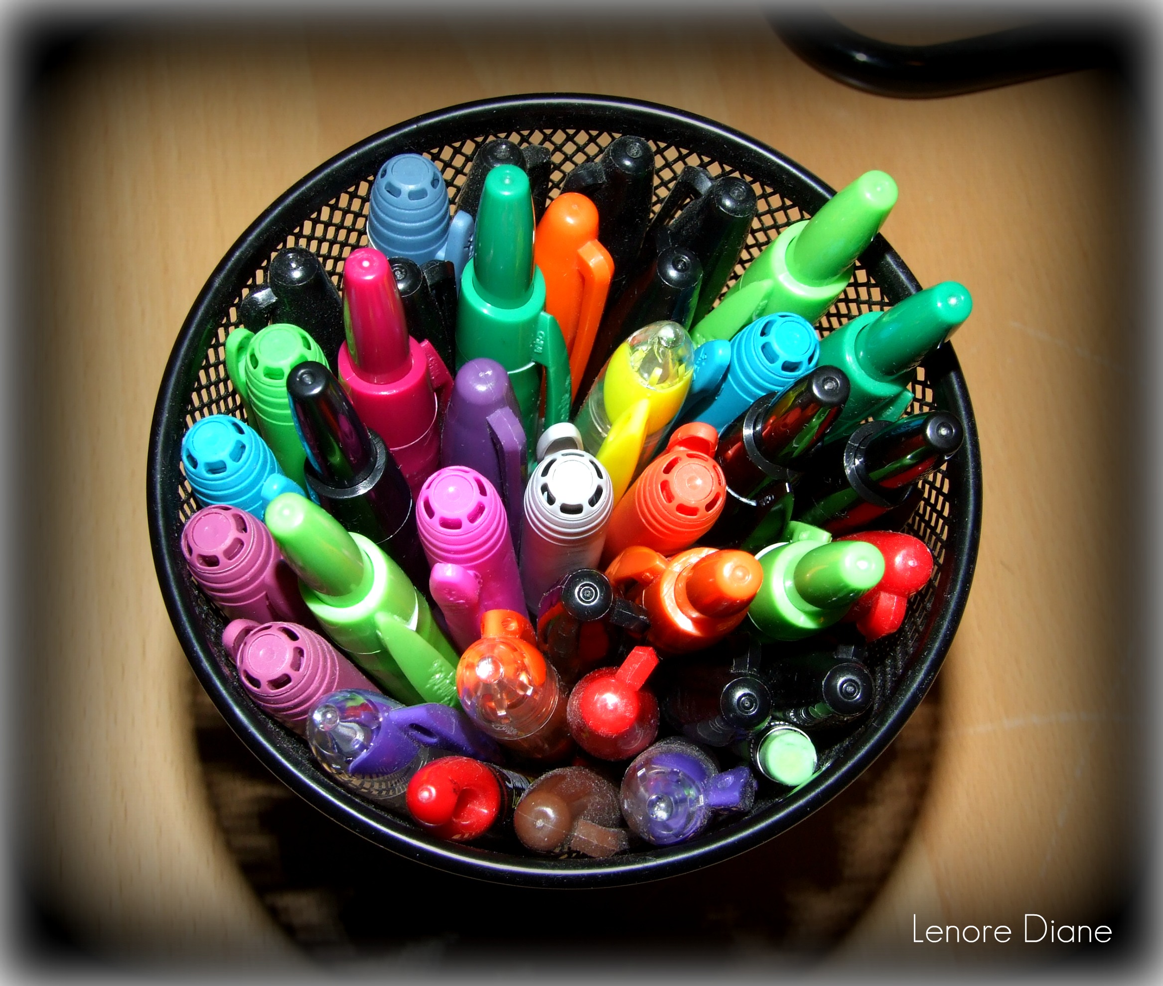 I love color, too. I color code my calendar at work to keep track of client meetings, personal appointments, days off, etc. It really helps to find things quickly. I would never have thought to snap a picture of a cup of pens. You are very clever and creative. Love the picture!