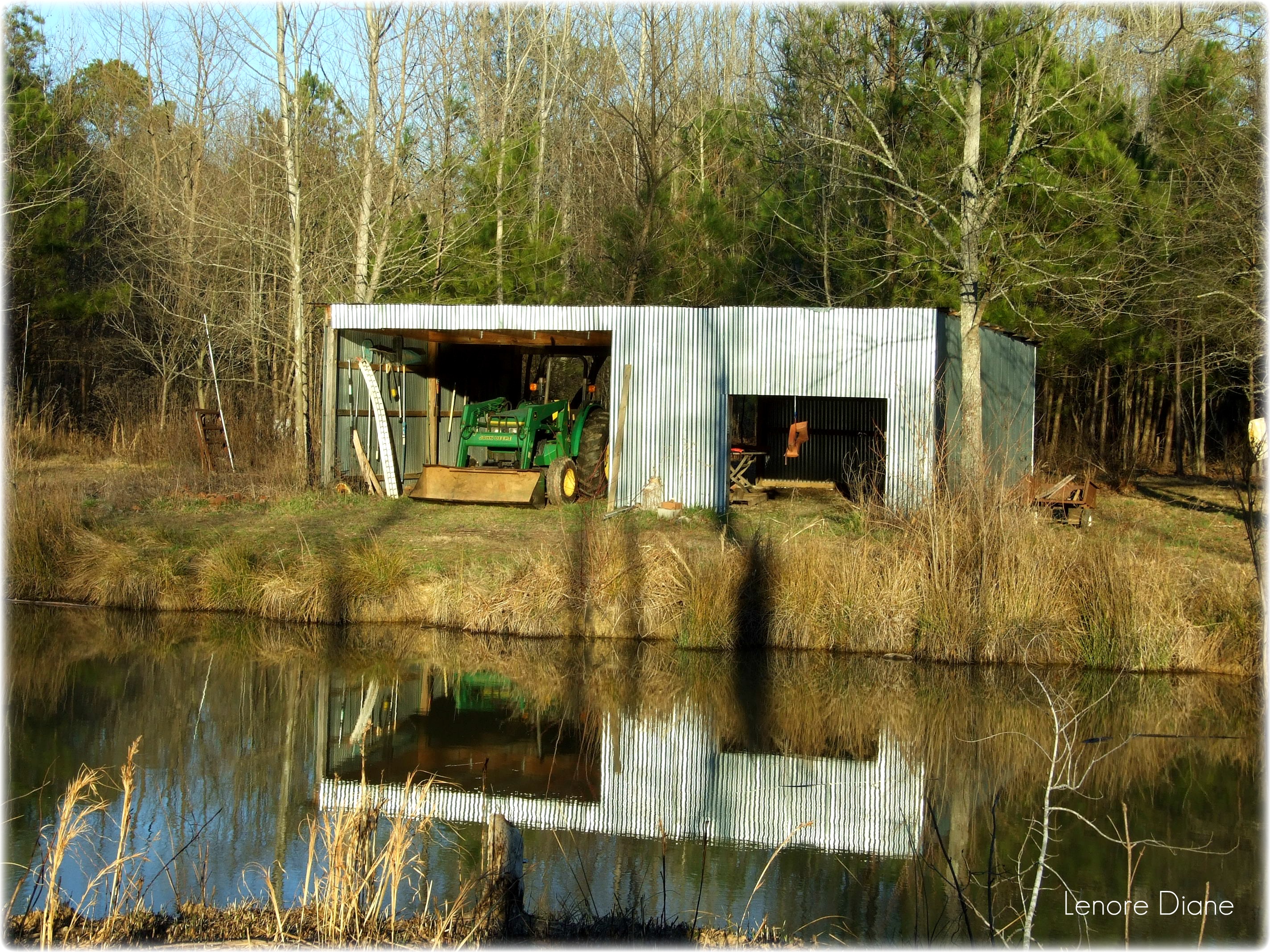 There is a rickety old bridge that takes you to a little island in the middle of one of the lakes. With the sun setting behind me, I was able to capture a nice shot of Mr. John’s garage, where he keeps his trusty John Deere tractor safe and sound.