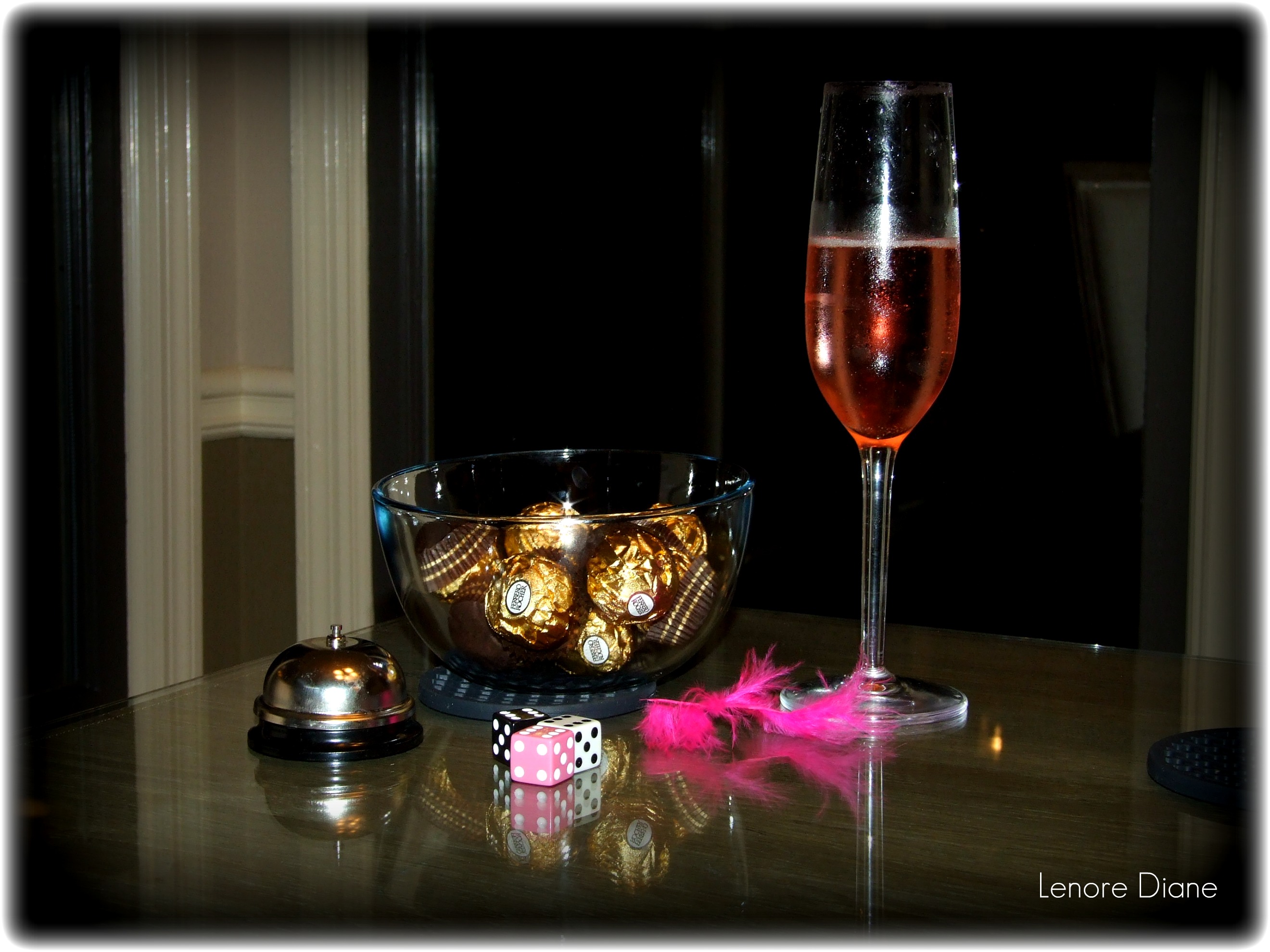 A nice touch, eh? Pink die, pink feather… and of course… the pink champagne. Yep, my neighbor made a good call.