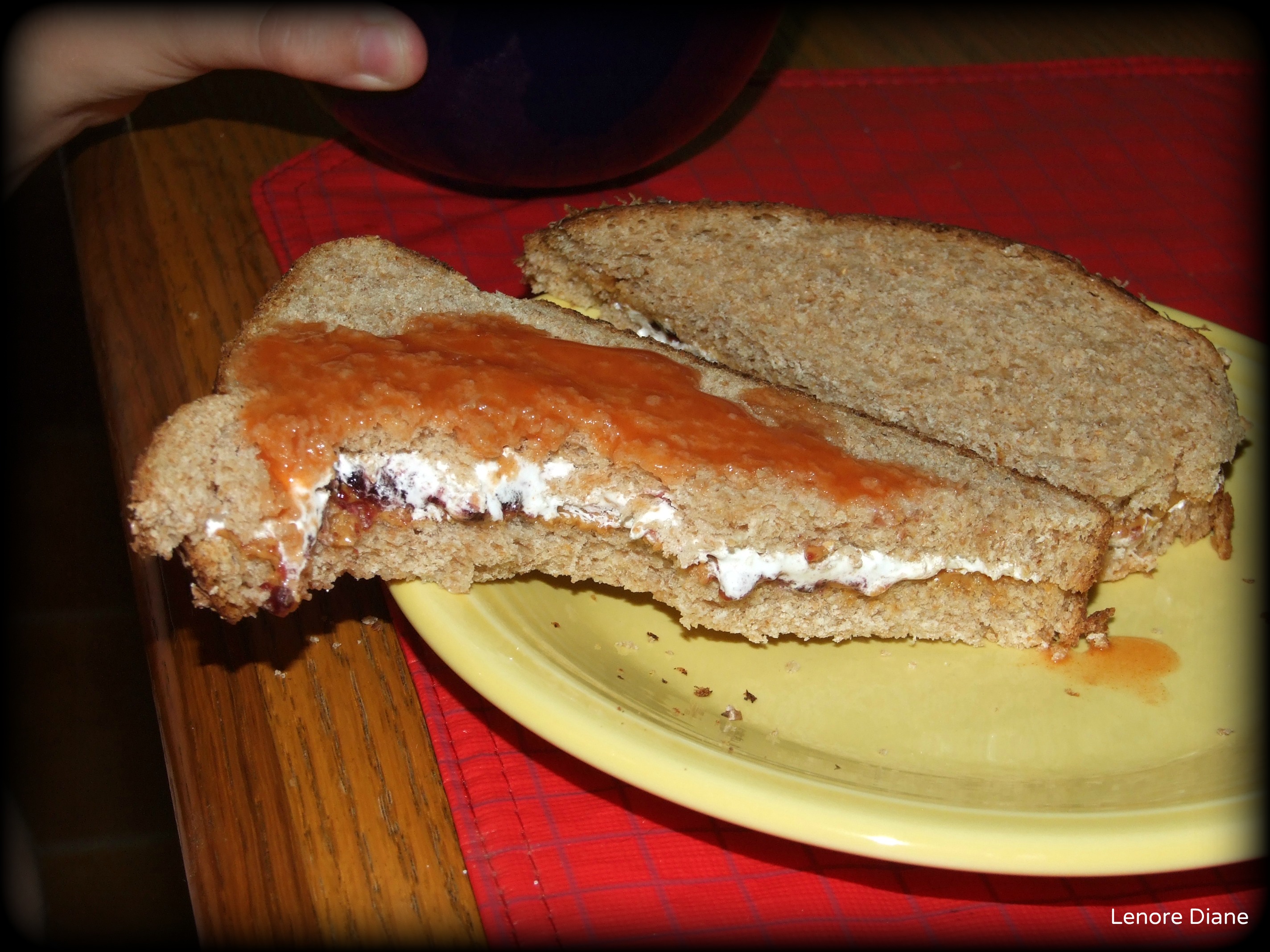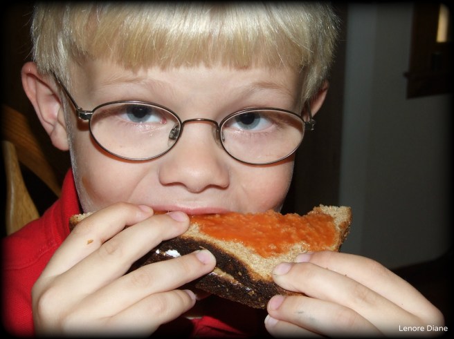 I’ve never had tomato soup with–let alone ON–my peanut butter sandwich. He reminds me of my granddaughter, always trying something new.
