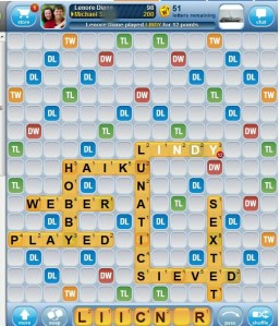 You pulled a word worth 108 points, Jackie?! I bow down to you. I’ve seen it done by others – but that is a feat I’ve never managed. Yet. (smile)