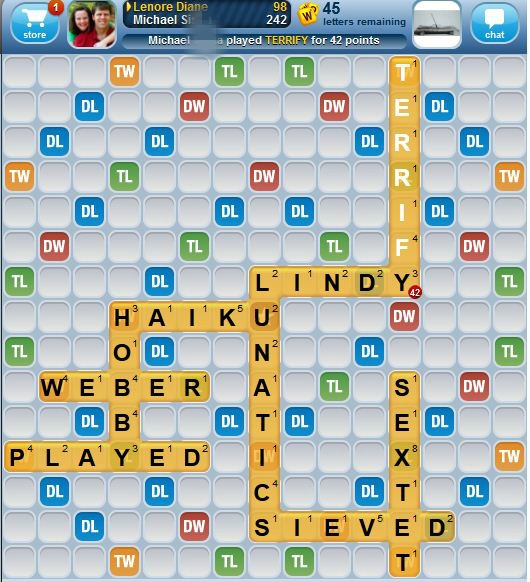 Oh. I am grateful my Mom is not on FB. She is most excellent at Scrabble, as are two of my sisters.