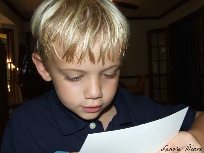 I think he was reading an invitation, BD. I swear, I was not forcing him to work. Swear. 🙂