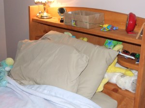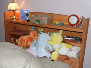 Blogary, earlier this week I changed the boys’ bed sheets. Putting the sheets on Joe’s bed is a bit challenging. When the bed is made and the pillows are ‘perfectly’ placed, Joe’s bed looks normal. However, if you move the pillows, you will see his menagerie of treasures. And, every night before he goes to bed, he checks his collection, adjusting it as needed.