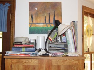 When I turn around, I am facing the computer hutch. Thankfully, I can hide the mess inside by closing the doors. Alas, I am unable to close any doors to hid the chaos organized papers Rob keeps on top of the hutch. Our house sitter will see this clutter, as I do not mess with my husband’s filing system.